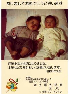 1988年の年賀状です。 前年の6月25日に出生しました。 この写真は多分11月くらいだと思います。 生後4か月くらいでしょう! まるまると太っています。 お兄ちゃん(今は大学4年生)は2歳前です。 私は八鹿病院からの出張から大学に復帰して3年目でした(助手)が、次年度の新潟大学医学部附属腎研究施設免疫病態学部門(清水不二雄教授、当時)内地留学に向けて、準備中でした。