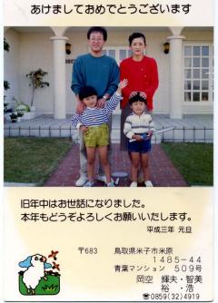 1991年の年賀状です。 私は2年前に新潟大学内地留学から大学に復帰し、講師(外来医長)に昇進させていただき、たまたま当時の文部省の科学研究費もいただき、腎臓グループの主任として臨床や研究(ねずみの実験)をがんばっていた時代です。 この写真は前年の10月に遅い夏休みをいただき、日本のエーゲ海と謳われる岡山県牛窓のペンションに泊まった時のものです。 私が36歳、妻は○○歳、長男は4歳(米子市のみずほ幼稚園年中)、浩は2歳です。