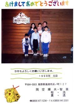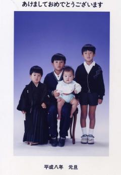 これはぐっと時代が進み、1996年の年賀状です。 私は1991年4月~1995年3月は鳥取県立中央病院に出張というか、赴任というか? 小児科医長として勤務していました。 その間の写真はまた別編でまとめますが、その間になんと2人の家族が増えていました。 3男(今や中学3年生、受験生!)と4男(今や中学1年生)です。 1995年4月からは三度目の大学復帰です。 この写真はその3男(ちょうど3歳)の七五三(ひも落とし)の時のものです。 長男(米子市立義方小学校4年生)、4男(生後8か月)、浩(義方小学校2年生)です。 浩はちょっとこの頃、不登校気味でした・・・