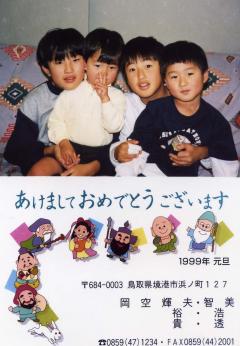 翌1999年の年賀状です。 我が家の居間でのひとときです。 3男(聖心幼稚園年長)の6歳の誕生日です。 彼は11月22日生まれですので、ちょうど年賀状の写真として誕生日が一番時期的に合致するという幸運の持ち主です。 長男(境港市立第一中学校1年生、いろいろ悩んでいたよね!)、四男(聖心幼稚園年少、おむつ取れてたかな?)、そして浩は境小学校少年野球チームに入部して、がんばっていました。 手に白い絆創膏がみえるでしょう! 顔の表情もいきいきしてますよね!