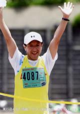 ところで、肝心のレースですが、40歳以上10kmの部に出走しました。 天候は曇り時々小雨といったところでした。 2000人以上の出走者あり、スタート直後は前後左右にランナーが溢れ、ぶつからないように気をつけながら走りました。 今回は50分切りを目標にしており、結構前半から飛ばしました。 2kmで10分10秒、3kmすぎには千葉真子さんに追いつき、「抜きますよ~」と冗談を飛ばし、ハイタッチしました(感激!)。 千葉さんも「どんどん、飛ばしてね~」と言って下さいました。 4kmで20分15秒と快調なペースでした。