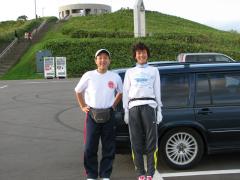クリボウの先導で、謎の美女と2人で走りました! 謎の美女は実はS小児科の奥様でご主人とご一緒にNFJに参加されたのです。 大のマラソン好きとのことでしたが、ただ者ではありませんでした! なんと、サロマ湖100kmウルトラマラソンの完走者だったのです~! とりあえず出走前、クリボウの愛車の前で・・・。