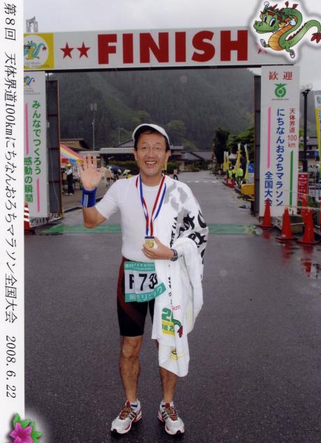 会場には8時前に到着。 100km組はこの会場を午前5時にすでにスタートしており、会場は閑散としていた。 早速受付したあと救護係のテントを覗くと、日南病院の副院長(外科)の平岡裕先生(鳥取大学医学部で1年後輩、冬だけスキー部の仲間)がおられたので、挨拶する。 『あ~、てるおちゃん! がんばって!』と学生時代と同じ呼び方で激励してくれた! 過疎地の地域医療に身体を張って尽力している超多忙の中、地域あげての事業に休日返上で協力している仲間に心から感謝!