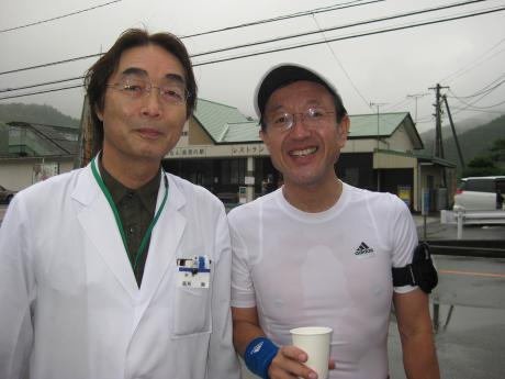 途中のエイドステイション(JR伯備線、上石見駅前)には、日南病院の救護班がスタンバイしていました。 日夜地域医療に尽力されている、日南病院院長の高見先生とツーショット! 鳥取県西部医師会の副会長としてもご活躍されています。 でも、その風貌は志村けんに似てるでしょ!? その人なつこさが良いんですよね! すばらしい、院長先生です! あ、変なおじさんったら変なおじさん、ってか?