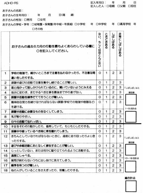 AD/HDが疑われる場合は、下記の問診票にチェックの上、受診して下さい。