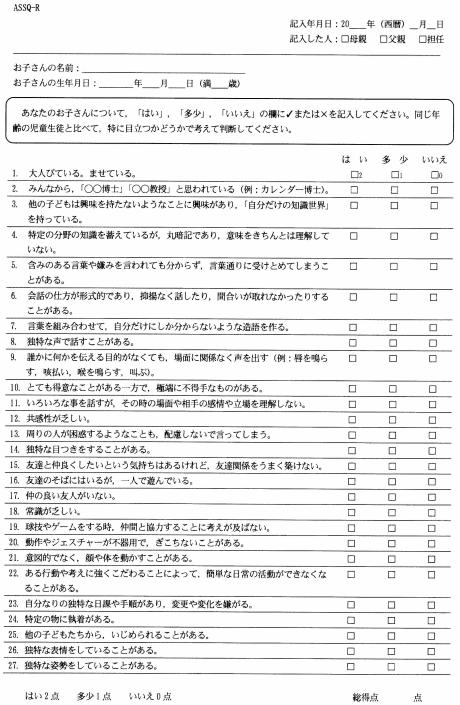 アスペルガー症候群が疑われる場合は下記の問診票にチェックの上、受診して下さい。