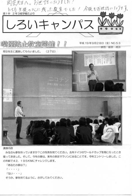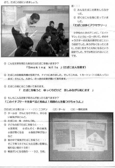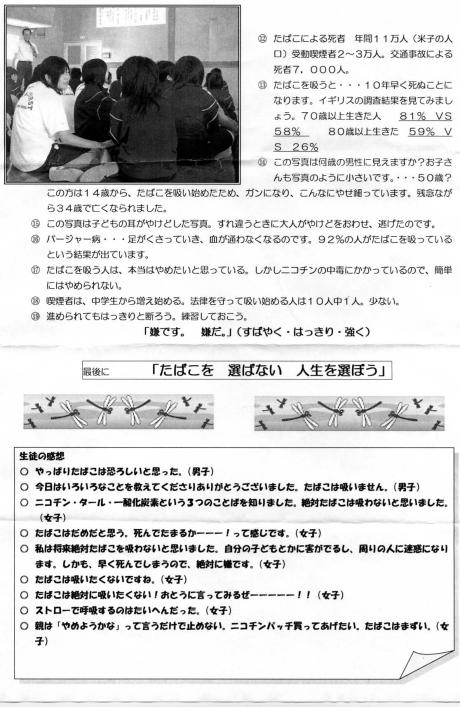2年前より母校である市立中学校(学校医ではありません)から依頼があり、2年生全員を対象に禁煙授業を行っています。 対象人数は1学年100~140名程度です。 体育館で実施しています。 授業は2コマを使い、約1時間授業し30分は感想文などに当てています。 授業の題名は『タバコは毒のかんづめータバコのさそいに「イヤだ!」と言おうーSmoking kills タバコを吸うと死ぬよ!』という長たらしい名前です。