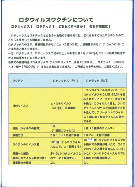 当院での接種料金はロタリックス(14000円×2で、合計28000円)、ロタテック(9000円×3、合計27000円)で、ほとんど差はありません。 ご希望の方を予約時に、ご指定ください。