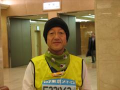 2008年2月17日、鳥取県は大雪だったようですが、東京は快晴、気温0~8度、微風という絶好のコンディションでした。 前日は本番に備え22時過ぎに床に着きましたが、興奮していたのでしょうね、午前3時に目が覚めてしまいました。 5時半には軽くシャワーを浴び、6時から朝食を取り、出走への準備をしました。 ホテルのロビーで色々な方(北は北海道から南は沖縄まで)と記念撮影をしたあと、8時過ぎにはホテルを出発して、スタート地点へ向かいました。 さすがに3万人以上の出走者がスタート地点に集まるだけで30分以上かかります。 スタートブロックは車いす、選考会、一般参加者はAからJまでの9ブロック(Iはありません)の順に並びましたが、この状態で30分間待たされました。 そして、9時10分、石原都知事の号令のもと、いよいよ東京マラソン2008がスタートしました。 私はちょうど真ん中あたりのEブロックでしたが、スタート地点に着くのに6分31秒かかりました。